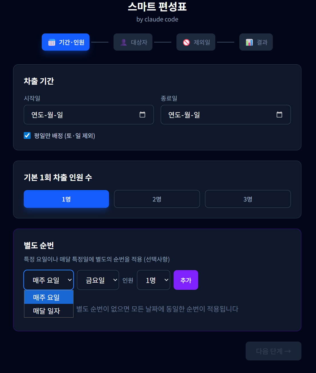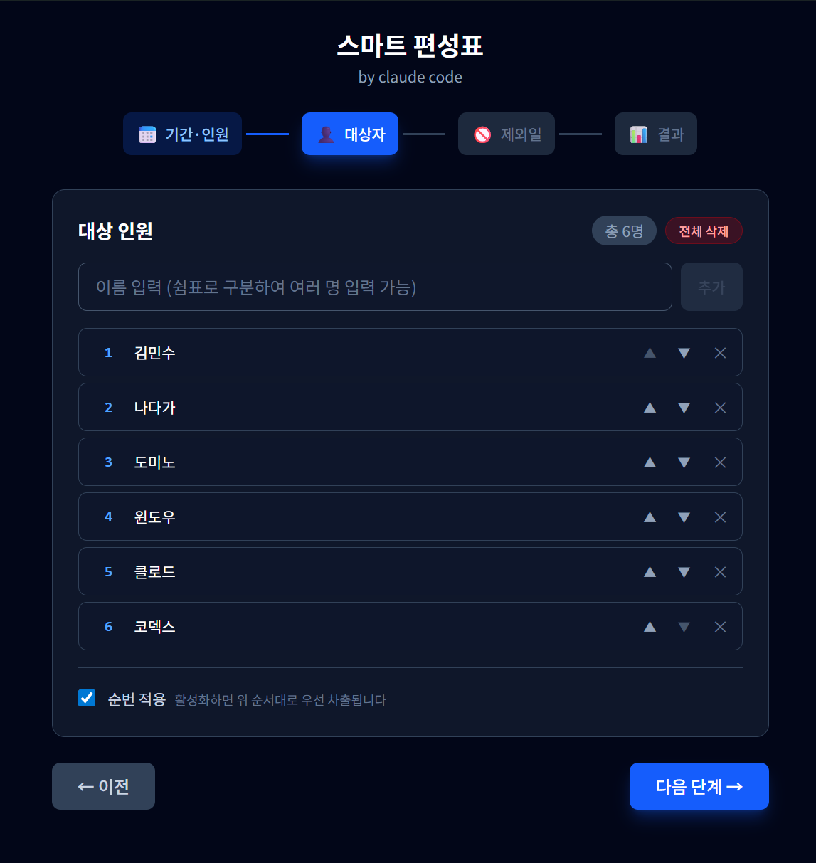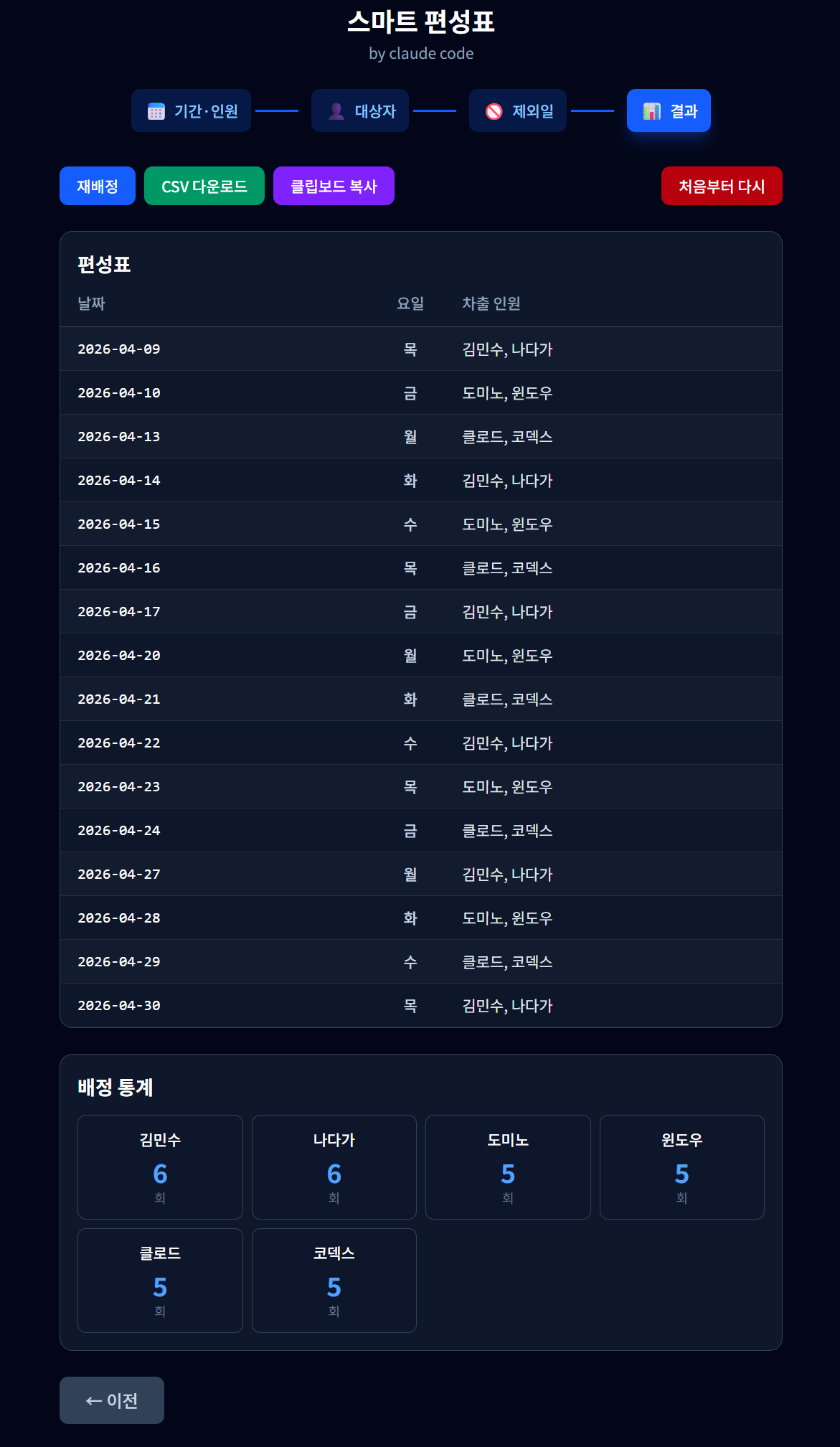 사람이 직접 배정하면, 아무리 공정하게 해도 "왜 나만 자주 가냐"는 불만이 생길 수 있습니다. 프로그램이 조건에 따라 자동으로 배정하면, 기준이 투명해집니다.
