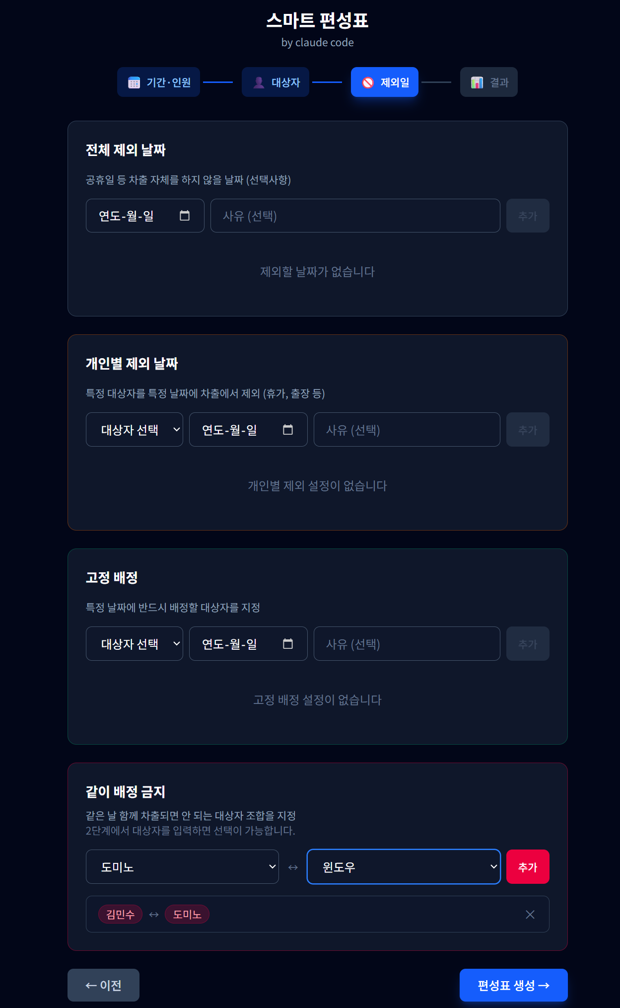 부재 일정, 고정 배치, 금지 조합까지 반영한 결과이니 납득이 가능합니다.