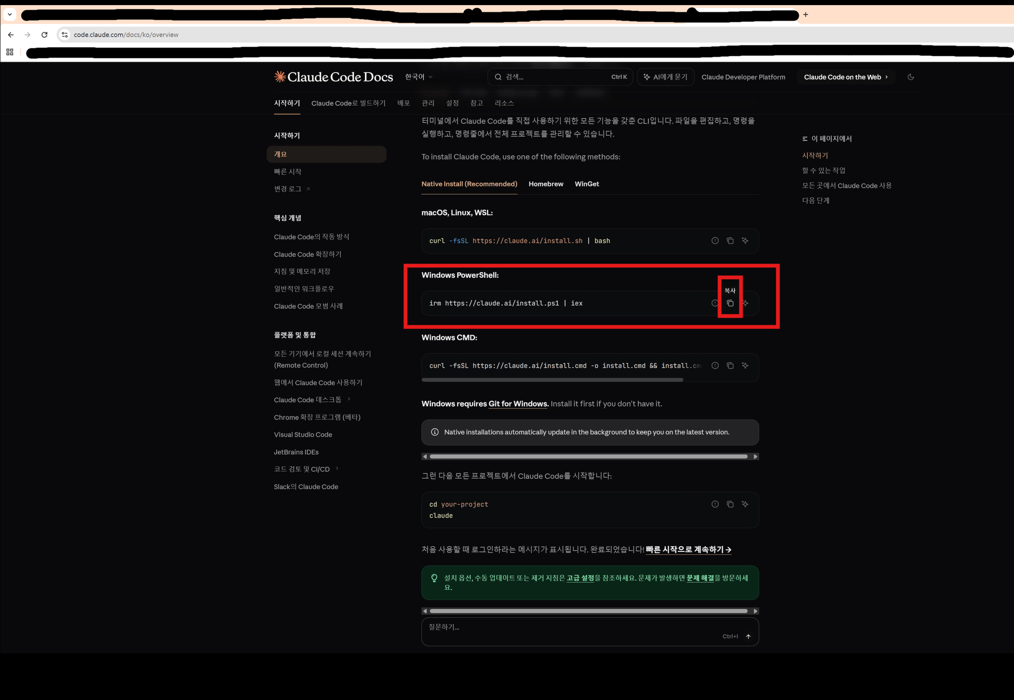이 페이지가 Claude Code의 공식 설치 안내 문서입니다. 한국어로도 제공되어 있어 참고하기 좋습니다. 이 문서에 나오는 설치 명령어를 그대로 사용할 예정입니다.