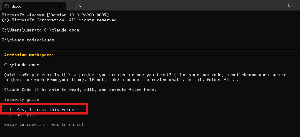 처음 실행하면 보안 확인 메시지가 나타납니다. "이 폴더를 신뢰하시나요?"라는 안내인데, 본인이 만든 폴더라면 1번(Yes, I trust this folder)을 선택하고 Enter를 누르면 됩니다.