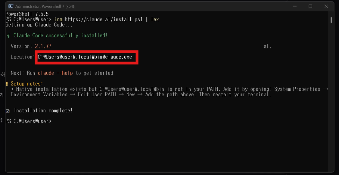 잠시 기다리면 "Claude Code successfully installed!"이라는 메시지가 표시됩니다. 이 화면이 보이면 설치 자체는 성공한 것입니다.