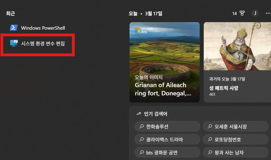 윈도우 검색창에 "시스템 환경 변수 편집"이라고 입력합니다. 일부 단어만 입력해도 됩니다. 검색 결과에서 해당 항목을 클릭합니다.
