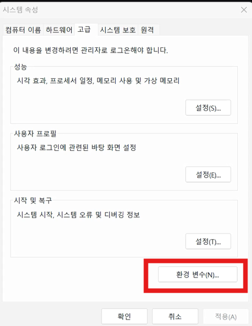 "시스템 속성" 창이 열리면, 하단의 "환경 변수(N)..." 버튼을 클릭합니다.