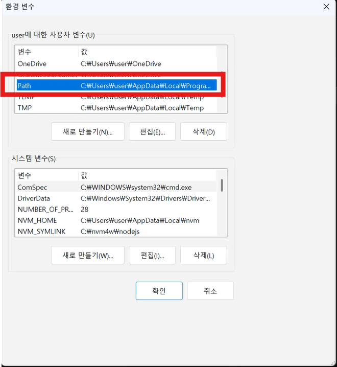 "환경 변수" 창이 열립니다. 위쪽의 "user에 대한 사용자 변수" 영역에서 "Path"를 찾아 더블클릭 합니다.