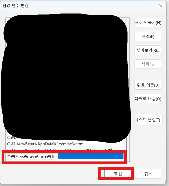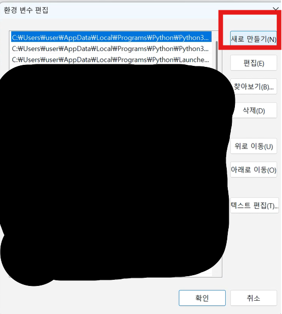 "새로 만들기(N)" 버튼을 클릭합니다. 빈 입력 칸이 나타나면, 아래 경로를 붙여넣기 합니다.