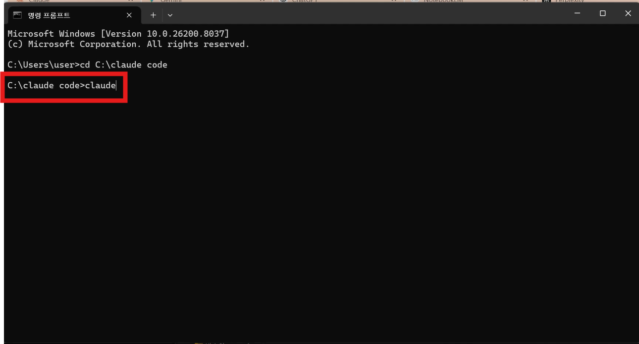 예를 들어 C 드라이브에 "claude code"라는 폴더를 만들었다면, 위와 같이 입력합니다.